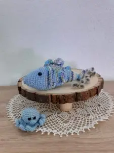 Diese beiden Figuren habe ich selbst gehäkelt – inspiriert vom Meer und seinen sanften Farben. Der kleine Fisch und die Krake bestehen aus Baumwollgarn und sind liebevoll von Hand gefertigt. Besonders gefallen mir die feinen Details wie die Tentakel der Krake und die gestreifte Flosse des Fisches. Beide gehören zu meinen maritimen Häkelprojekten, die beim Arbeiten einfach gute Laune machen.