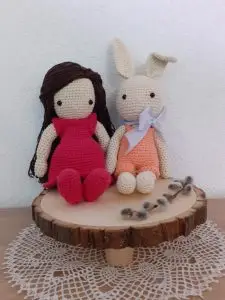 Diese beiden Figuren sind Teil einer kleinen Serie aus Baumwollgarn. Die Puppe mit dem roten Kleid und das Häschen mit Halstuch ergänzen sich perfekt – schlicht, freundlich und voller Charakter. Bei der Gestaltung habe ich besonders auf die kleinen Details geachtet: die langen Haare, die runden Pfoten und die feinen Farbtöne. Solche Figuren entstehen meist aus spontanen Ideen und wachsen Masche für Masche zu kleinen Persönlichkeiten heran.
